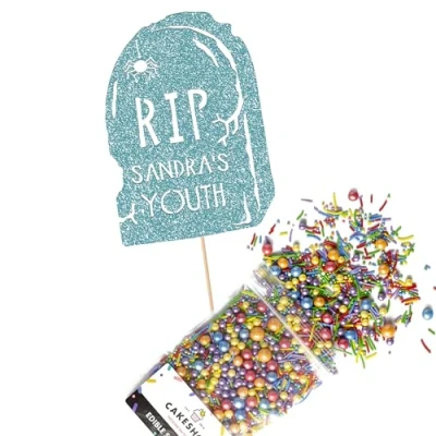 Cakeshop Cake Decoration Pack Funny RIP Gravestone Premium Double Sided Glitter Card Topper Sign & 25g Party of Sugar Sprinkles Custom Name Decorations (Baby Blue)
