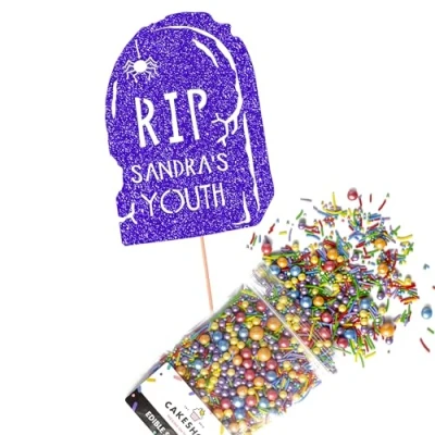 Cakeshop Cake Decoration Pack Funny RIP Gravestone Premium Double Sided Glitter Card Topper Sign & 25g Party of Sugar Sprinkles Custom Name Decorations (Bright Blue)