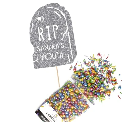 Cakeshop Cake Decoration Pack Funny RIP Gravestone Premium Double Sided Glitter Card Topper Sign & 25g Party of Sugar Sprinkles Custom Name Decorations (Dark Silver)