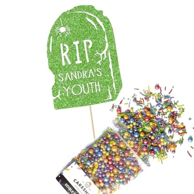 Cakeshop Cake Decoration Pack Funny RIP Gravestone Premium Double Sided Glitter Card Topper Sign & 25g Party of Sugar Sprinkles Custom Name Decorations (Green)