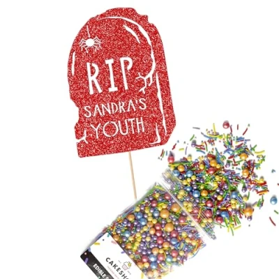 Cakeshop Cake Decoration Pack Funny RIP Gravestone Premium Double Sided Glitter Card Topper Sign & 25g Party of Sugar Sprinkles Custom Name Decorations (Red)