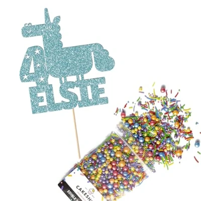 Cakeshop Cake Decoration Pack Funny Unicorn Theme Premium Double Sided Glitter Card Topper & 25g Party of Sugar Sprinkles Custom Name Age Decorations (Baby Blue)