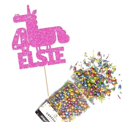 Cakeshop Cake Decoration Pack Funny Unicorn Theme Premium Double Sided Glitter Card Topper & 25g Party of Sugar Sprinkles Custom Name Age Decorations (Baby Pink)