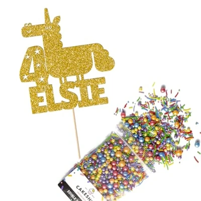 Cakeshop Cake Decoration Pack Funny Unicorn Theme Premium Double Sided Glitter Card Topper & 25g Party of Sugar Sprinkles Custom Name Age Decorations (Gold)