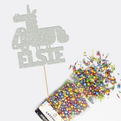 Cakeshop Cake Decoration Pack Funny Unicorn Theme Premium Double Sided Glitter Card Topper & 25g Party of Sugar Sprinkles Custom Name Age Decorations (Light Silver)