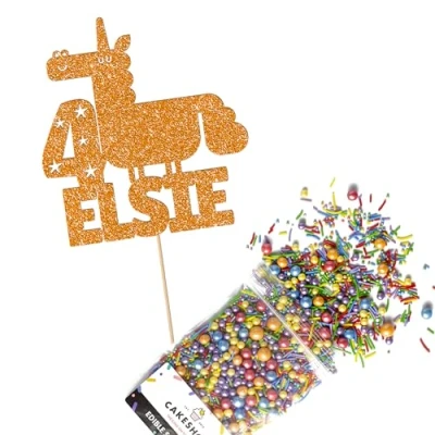 This Cakeshop Cake Decorating Pack includes 1 x 480gsm Double Sided Glitter Card Topper & 25g Cake Sprinkles (option to upgrade to 50g while customising) - perfect for your party or celebration! Cakeshop Sprinkles are Vegan, Gluten Free, Lactose free and Nut Free, all while looking amazing in striking colours and an assortment of sizes for a truly 'premium' finish Size: Sprinkles pack (perfect for a large cake) 25g, you can also upgrade to a 50g pack when customising your topper | Glitter Topper Approx 152mm (6") x 175mm (7") Toppers make a great keepsake to remember this special occasion forever, often our customers will remove the support sick and use on bedroom doors (until their next birthday!) Cakeshop Glitter Toppers are made from 480gsm premium double sided glitter card, select which colour topper you'd like then click 'Customise' to add your text personalisation and choose your sprinkles Choose from either Metallic or Rainbow sprinkles and upgrade to 50g packs in the 'Customise' section, so that you can match your sprinkles to your theme (or save them for next time!) All 'Cakeshop Cake Decorating Packs' come beautifully packed with simple to understand instructions so that you can quickly turn any cake, home made or shop bought (we wont tell!) into the perfect cake After you have added your custom information in the 'Customise Now' section our designers hand make your topper in the same font, style and topper colour as the design you've selected Cakeshop have been making the highest quality Cake Decorations since 2011 - we have thousands of design options available in our store for every occasion and theme (click 'visit the cakeshop store' above) It should go without saying - but Glitter Card toppers are flamable! We therefore recommend using only Acrylic toppers alongside candles for safety