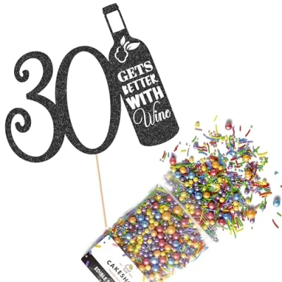 Cakeshop Cake Decoration Pack Funny Wine Theme Birthday Premium Double Sided Glitter Card Topper Sign & 25g Party of Sugar Sprinkles Custom Age (Black)