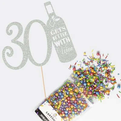 Cakeshop Cake Decoration Pack Funny Wine Theme Birthday Premium Double Sided Glitter Card Topper Sign & 25g Party of Sugar Sprinkles Custom Age (Light Silver)