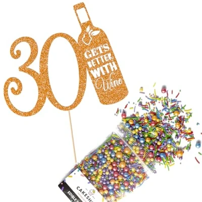 Cakeshop Cake Decoration Pack Funny Wine Theme Birthday Premium Double Sided Glitter Card Topper Sign & 25g Party of Sugar Sprinkles Custom Age (Orange)