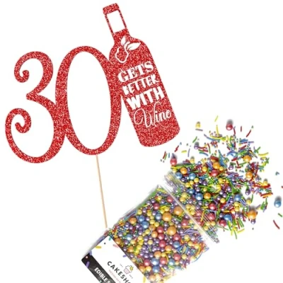 Cakeshop Cake Decoration Pack Funny Wine Theme Birthday Premium Double Sided Glitter Card Topper Sign & 25g Party of Sugar Sprinkles Custom Age (Red)