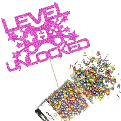 Cakeshop Cake Decoration Pack Gaming Controller Theme Premium Double Sided Glitter Card Topper Sign & 25g Party of Sugar Sprinkles Custom Age Decorations (Bright Pink)