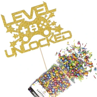Cakeshop Cake Decoration Pack Gaming Controller Theme Premium Double Sided Glitter Card Topper Sign & 25g Party of Sugar Sprinkles Custom Age Decorations (Gold)