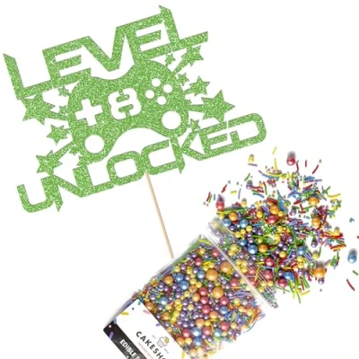 Cakeshop Cake Decoration Pack Gaming Controller Theme Premium Double Sided Glitter Card Topper Sign & 25g Party of Sugar Sprinkles Custom Age Decorations (Green)