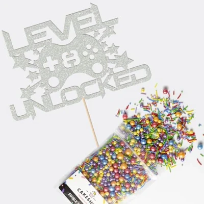 Cakeshop Cake Decoration Pack Gaming Controller Theme Premium Double Sided Glitter Card Topper Sign & 25g Party of Sugar Sprinkles Custom Age Decorations (Light Silver)
