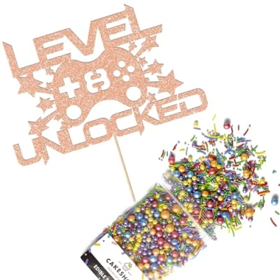 Cakeshop Cake Decoration Pack Gaming Controller Theme Premium Double Sided Glitter Card Topper Sign & 25g Party of Sugar Sprinkles Custom Age Decorations (Rose Gold)