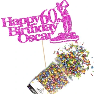 Cakeshop Cake Decoration Pack Golf Theme Birthday Premium Double Sided Glitter Card Topper & 25g Party of Sugar Sprinkles Custom Name Age Decorations (Bright Pink)