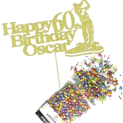 Cakeshop Cake Decoration Pack Golf Theme Birthday Premium Double Sided Glitter Card Topper & 25g Party of Sugar Sprinkles Custom Name Age Decorations (Champagne)