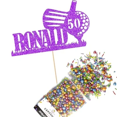 Cakeshop Cake Decoration Pack Golf Theme Birthday Premium Double Sided Glitter Card Topper & 25g Party of Sugar Sprinkles Custom Name Age Decorations (Purple)
