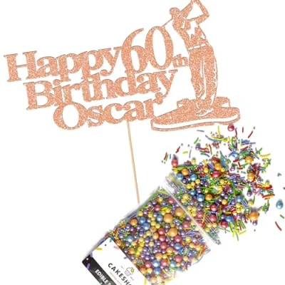 Cakeshop Cake Decoration Pack Golf Theme Birthday Premium Double Sided Glitter Card Topper & 25g Party of Sugar Sprinkles Custom Name Age Decorations (Rose Gold)
