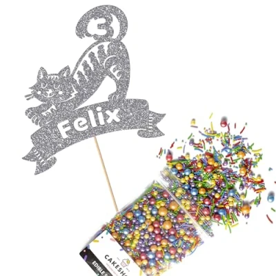 Cakeshop Cake Decoration Pack Happy Birthday Cat Premium Double Sided Glitter Card Topper Sign & 25g Party of Sugar Sprinkles Custom Name Age (Dark Silver)