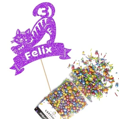 Cakeshop Cake Decoration Pack Happy Birthday Cat Premium Double Sided Glitter Card Topper Sign & 25g Party of Sugar Sprinkles Custom Name Age (Purple)