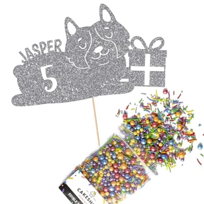 Cakeshop Cake Decoration Pack Happy Birthday Dog Premium Double Sided Glitter Card Topper Sign & 25g Party of Sugar Sprinkles Custom Name Age (Dark Silver)