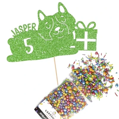 Cakeshop Cake Decoration Pack Happy Birthday Dog Premium Double Sided Glitter Card Topper Sign & 25g Party of Sugar Sprinkles Custom Name Age (Green)