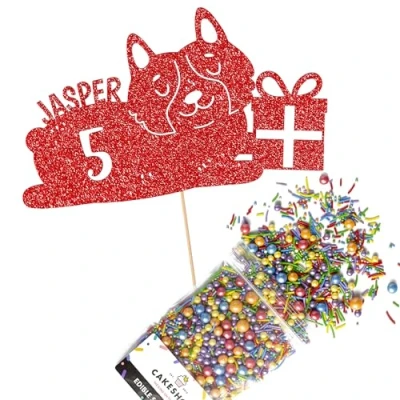 Cakeshop Cake Decoration Pack Happy Birthday Dog Premium Double Sided Glitter Card Topper Sign & 25g Party of Sugar Sprinkles Custom Name Age (Red)