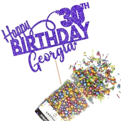 This Cakeshop Cake Decorating Pack includes 1 x 480gsm Double Sided Glitter Card Topper & 25g Cake Sprinkles (option to upgrade to 50g while customising) - perfect for your party or celebration! Cakeshop Sprinkles are Vegan, Gluten Free, Lactose free and Nut Free, all while looking amazing in striking colours and an assortment of sizes for a truly 'premium' finish Size: Sprinkles pack (perfect for a large cake) 25g, you can also upgrade to a 50g pack when customising your topper | Glitter Topper Approx 152mm (6") x 175mm (7") Toppers make a great keepsake to remember this special occasion forever, often our customers will remove the support sick and use on bedroom doors (until their next birthday!) Cakeshop Glitter Toppers are made from 480gsm premium double sided glitter card, select which colour topper you'd like then click 'Customise' to add your text personalisation and choose your sprinkles Choose from either Metallic or Rainbow sprinkles and upgrade to 50g packs in the 'Customise' section, so that you can match your sprinkles to your theme (or save them for next time!) All 'Cakeshop Cake Decorating Packs' come beautifully packed with simple to understand instructions so that you can quickly turn any cake, home made or shop bought (we wont tell!) into the perfect cake After you have added your custom information in the 'Customise Now' section our designers hand make your topper in the same font, style and topper colour as the design you've selected Cakeshop have been making the highest quality Cake Decorations since 2011 - we have thousands of design options available in our store for every occasion and theme (click 'visit the cakeshop store' above) It should go without saying - but Glitter Card toppers are flamable! We therefore recommend using only Acrylic toppers alongside candles for safety