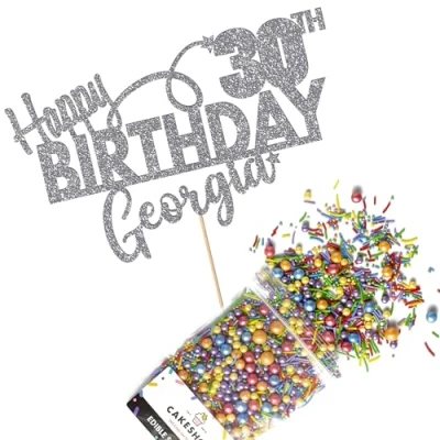 Cakeshop Cake Decoration Pack Happy Birthday Premium Double Sided Glitter Card Topper Sign & 25g Party of Sugar Sprinkles Custom Name Age Decorations (Dark Silver)