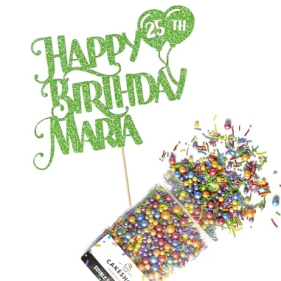 Cakeshop Cake Decoration Pack Happy Birthday Premium Double Sided Glitter Card Topper Sign & 25g Party of Sugar Sprinkles Custom Name Age Decorations (Green)