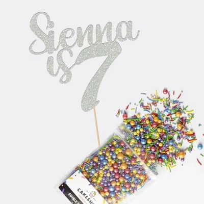 This Cakeshop Cake Decorating Pack includes 1 x 480gsm Double Sided Glitter Card Topper & 25g Cake Sprinkles (option to upgrade to 50g while customising) - perfect for your party or celebration! Cakeshop Sprinkles are Vegan, Gluten Free, Lactose free and Nut Free, all while looking amazing in striking colours and an assortment of sizes for a truly 'premium' finish Size: Sprinkles pack (perfect for a large cake) 25g, you can also upgrade to a 50g pack when customising your topper | Glitter Topper Approx 152mm (6") x 175mm (7") Toppers make a great keepsake to remember this special occasion forever, often our customers will remove the support sick and use on bedroom doors (until their next birthday!) Cakeshop Glitter Toppers are made from 480gsm premium double sided glitter card, select which colour topper you'd like then click 'Customise' to add your text personalisation and choose your sprinkles Choose from either Metallic or Rainbow sprinkles and upgrade to 50g packs in the 'Customise' section, so that you can match your sprinkles to your theme (or save them for next time!) All 'Cakeshop Cake Decorating Packs' come beautifully packed with simple to understand instructions so that you can quickly turn any cake, home made or shop bought (we wont tell!) into the perfect cake After you have added your custom information in the 'Customise Now' section our designers hand make your topper in the same font, style and topper colour as the design you've selected Cakeshop have been making the highest quality Cake Decorations since 2011 - we have thousands of design options available in our store for every occasion and theme (click 'visit the cakeshop store' above) It should go without saying - but Glitter Card toppers are flamable! We therefore recommend using only Acrylic toppers alongside candles for safety