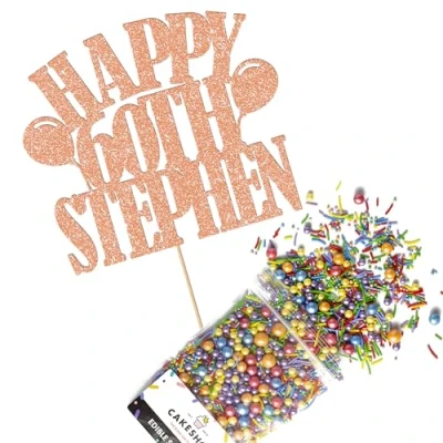 Cakeshop Cake Decoration Pack Happy Birthday Premium Double Sided Glitter Card Topper Sign & 25g Party of Sugar Sprinkles Custom Name Age Decorations (Rose Gold)