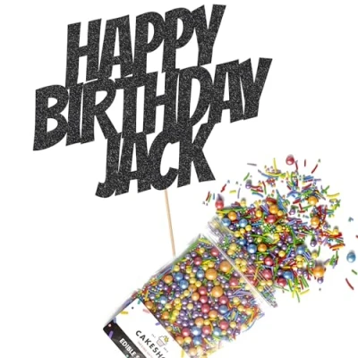 Cakeshop Cake Decoration Pack Happy Birthday Premium Double Sided Glitter Card Topper Sign & 25g Party of Sugar Sprinkles Custom Name Decorations (Black)