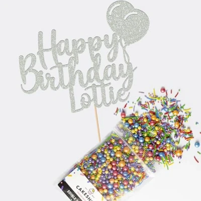 This Cakeshop Cake Decorating Pack includes 1 x 480gsm Double Sided Glitter Card Topper & 25g Cake Sprinkles (option to upgrade to 50g while customising) - perfect for your party or celebration! Cakeshop Sprinkles are Vegan, Gluten Free, Lactose free and Nut Free, all while looking amazing in striking colours and an assortment of sizes for a truly 'premium' finish Size: Sprinkles pack (perfect for a large cake) 25g, you can also upgrade to a 50g pack when customising your topper | Glitter Topper Approx 152mm (6") x 175mm (7") Toppers make a great keepsake to remember this special occasion forever, often our customers will remove the support sick and use on bedroom doors (until their next birthday!) Cakeshop Glitter Toppers are made from 480gsm premium double sided glitter card, select which colour topper you'd like then click 'Customise' to add your text personalisation and choose your sprinkles Choose from either Metallic or Rainbow sprinkles and upgrade to 50g packs in the 'Customise' section, so that you can match your sprinkles to your theme (or save them for next time!) All 'Cakeshop Cake Decorating Packs' come beautifully packed with simple to understand instructions so that you can quickly turn any cake, home made or shop bought (we wont tell!) into the perfect cake After you have added your custom information in the 'Customise Now' section our designers hand make your topper in the same font, style and topper colour as the design you've selected Cakeshop have been making the highest quality Cake Decorations since 2011 - we have thousands of design options available in our store for every occasion and theme (click 'visit the cakeshop store' above) It should go without saying - but Glitter Card toppers are flamable! We therefore recommend using only Acrylic toppers alongside candles for safety