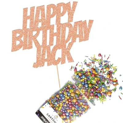 Cakeshop Cake Decoration Pack Happy Birthday Premium Double Sided Glitter Card Topper Sign & 25g Party of Sugar Sprinkles Custom Name Decorations (Rose Gold)