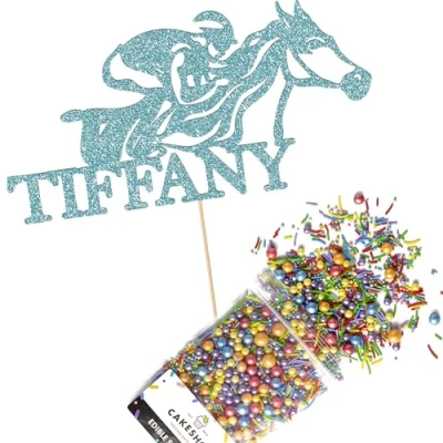 Cakeshop Cake Decoration Pack Horse Racing Theme Premium Double Sided Glitter Card Topper Sign & 25g Party of Sugar Sprinkles Custom Name Decorations (Baby Blue)