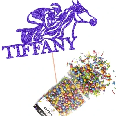 Cakeshop Cake Decoration Pack Horse Racing Theme Premium Double Sided Glitter Card Topper Sign & 25g Party of Sugar Sprinkles Custom Name Decorations (Bright Blue)