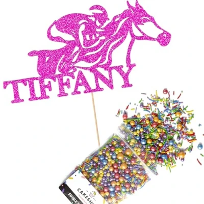 Cakeshop Cake Decoration Pack Horse Racing Theme Premium Double Sided Glitter Card Topper Sign & 25g Party of Sugar Sprinkles Custom Name Decorations (Bright Pink)