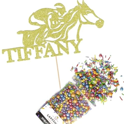 Cakeshop Cake Decoration Pack Horse Racing Theme Premium Double Sided Glitter Card Topper Sign & 25g Party of Sugar Sprinkles Custom Name Decorations (Champagne)