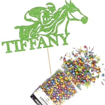 Cakeshop Cake Decoration Pack Horse Racing Theme Premium Double Sided Glitter Card Topper Sign & 25g Party of Sugar Sprinkles Custom Name Decorations (Green)