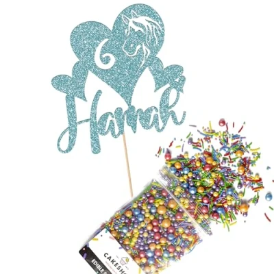 Cakeshop Cake Decoration Pack Horse Theme Birthday Premium Double Sided Glitter Card Topper & 25g Party of Sugar Sprinkles Custom Name Age Decorations (Baby Blue)