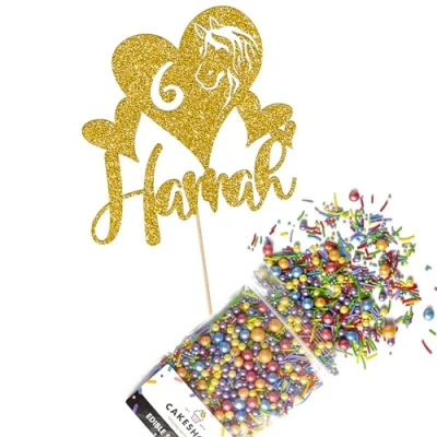 Cakeshop Cake Decoration Pack Horse Theme Birthday Premium Double Sided Glitter Card Topper & 25g Party of Sugar Sprinkles Custom Name Age Decorations (Gold)