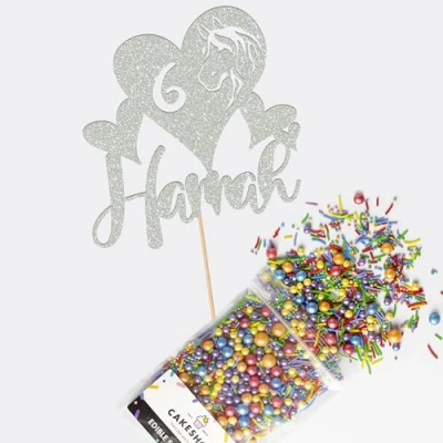 Cakeshop Cake Decoration Pack Horse Theme Birthday Premium Double Sided Glitter Card Topper & 25g Party of Sugar Sprinkles Custom Name Age Decorations (Light Silver)