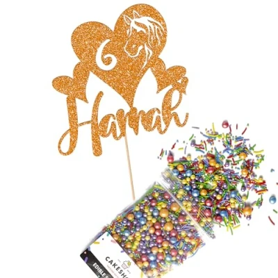 Cakeshop Cake Decoration Pack Horse Theme Birthday Premium Double Sided Glitter Card Topper & 25g Party of Sugar Sprinkles Custom Name Age Decorations (Orange)