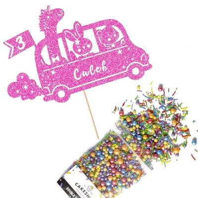 Cakeshop Cake Decoration Pack Jungle Animal Zoo Bus Premium Double Sided Glitter Card Topper & 25g Party of Sugar Sprinkles Custom Name Age Decorations (Baby Pink)