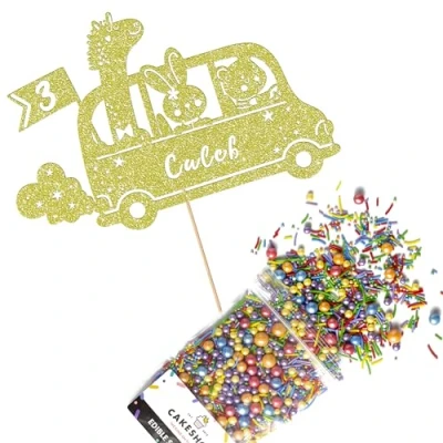 Cakeshop Cake Decoration Pack Jungle Animal Zoo Bus Premium Double Sided Glitter Card Topper & 25g Party of Sugar Sprinkles Custom Name Age Decorations (Champagne)