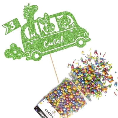 Cakeshop Cake Decoration Pack Jungle Animal Zoo Bus Premium Double Sided Glitter Card Topper & 25g Party of Sugar Sprinkles Custom Name Age Decorations (Green)
