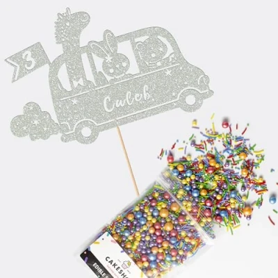 Cakeshop Cake Decoration Pack Jungle Animal Zoo Bus Premium Double Sided Glitter Card Topper & 25g Party of Sugar Sprinkles Custom Name Age Decorations (Light Silver)
