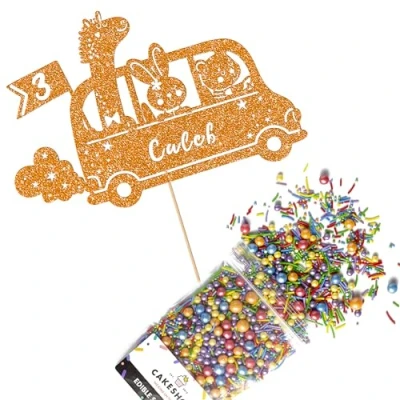 Cakeshop Cake Decoration Pack Jungle Animal Zoo Bus Premium Double Sided Glitter Card Topper & 25g Party of Sugar Sprinkles Custom Name Age Decorations (Orange)